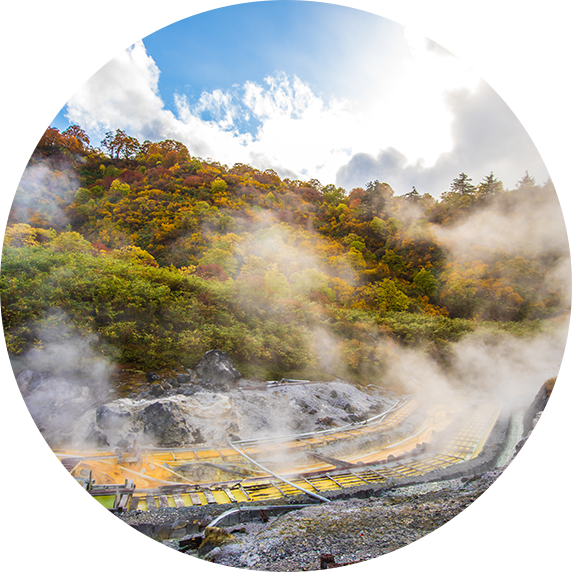 iki-iki-health-careで扱う商品は玉川温泉に由来するものです。十和田八幡平国立公園内にある玉川温泉は岩盤浴や湯治で世界的にも有名な温泉です。標高740メートル四方が緑の山々に囲まれた風光明媚で閑静な場所であり、溶岩層の断崖には岩燕が乱舞するといった、自然豊かな環境にあります。この中央の地獄谷の方には、凄まじい勢いで熱湯を湧出する「大噴の湯」があり、98度の 熱湯が毎分9000リットル吹き出し、日本一の湧出量と多くの温泉成分を含みます。玉川温泉の泉質はpH1.2と極めて酸性が強く、硫黄臭と微量のラジウム放射線が含まれているという特徴があります。地盤には微量のラジウムや豊富なマイナスイオンなどが含まれており、多くの湯治客、岩盤浴客が訪れています。